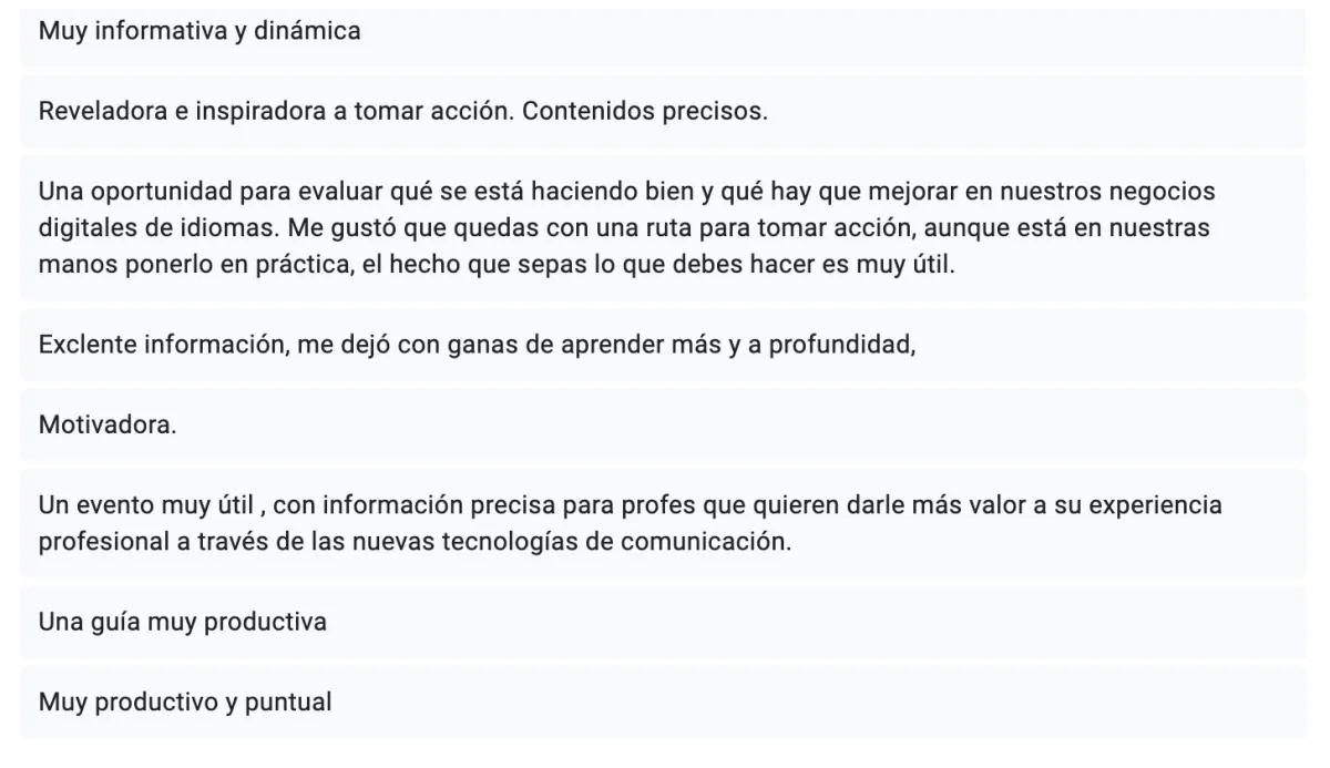 Los resultados que tú consigas con tu negocio como profe de idiomas dependerán de múltiples factores propios de tu contexto, incluyendo (pero no limitándose a) tu contenido, tu modelo de negocio, tu oferta educativa, tu constancia y tu capacidad para implementar lo aprendido.